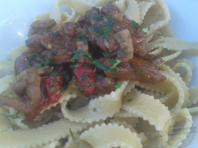 Den Bräter auf dem Grill hochgeheizt,Butterschmalz rein, 2 Zwiebeln, 4 Zehen Knoblauch und 4 Spitzpaprika dazu.Dann das Kaninchen rein und etwas tomatenmark so wie Univer Piros Arany Paprikamark dazu.Alles angeschmort und abgelöscht mit Rotwein und Hühnerbrühe.Jetzt noch 3 Lorbeerblätter hinzu und nich 1 Rosmarinzweig.Nun ca 1,5 h schmoren lassen und bis dahin war die Soße schön eingedickt.