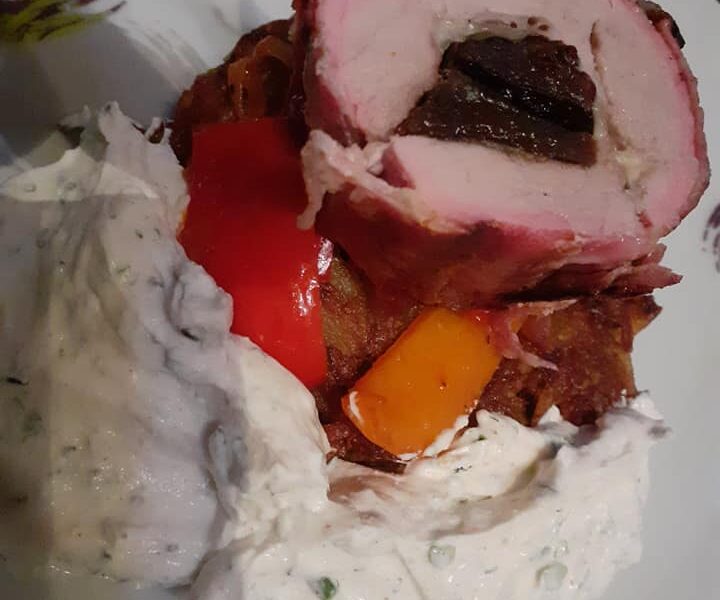 Nun mit den Pflaumen und dem Manchego-Käse füllen und Pfeffern und Salzen, das Filet schließen und in das Bacon-Netz wickeln.