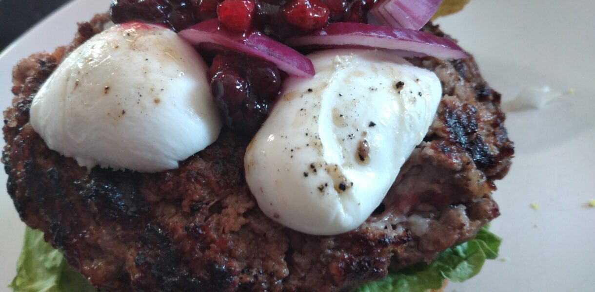 Ein wunderbarer Büffelpattie auf Laugenbun mit Preiselbeeren/Waldfrüchtegelee