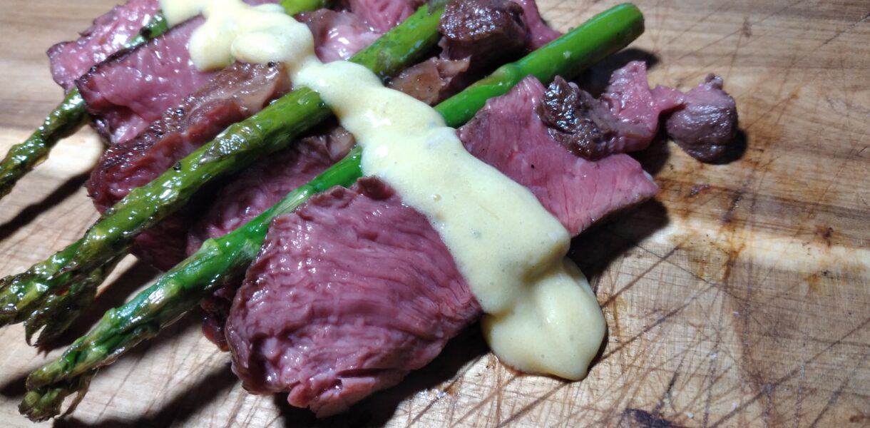 Glücklicher Büffel trifft feinen grünen Babyspargel an Sauce Bérnaise.