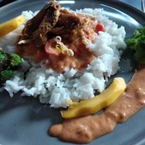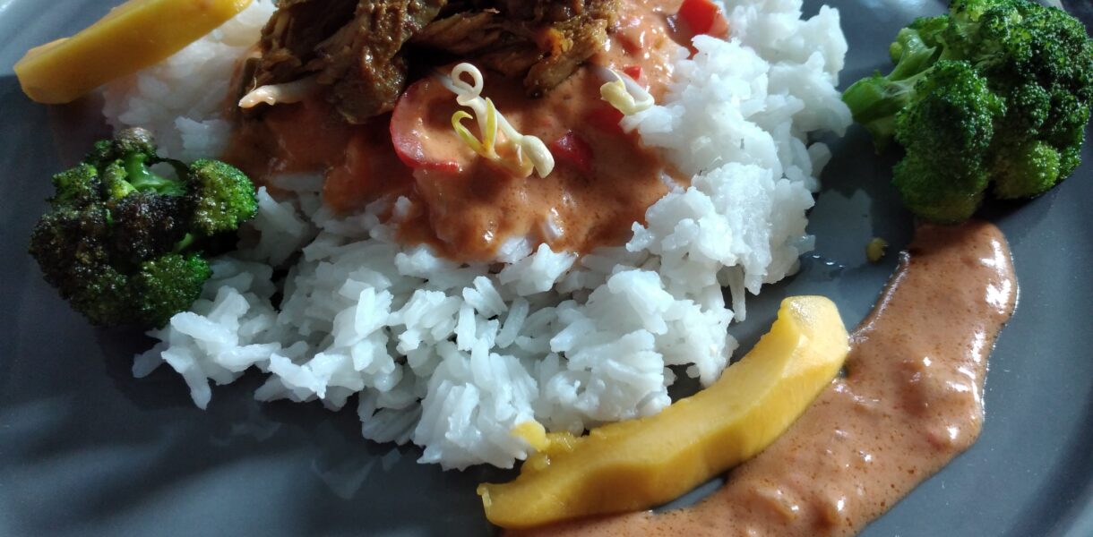 - Grill auf 110 Grad, indirekte Hitze, bzw Ofen auf 110 Grad erhitzen.Hop Sing, Thai Curry und Sesamöl zu einer Paste verrühren und gleichmäßig auf der Pute verteilen.Die marinierte Keule in eine Edelstahlform mit Rost geben und ca 4,5 h garen lassen.Die Kerntemperatur liegt dann bei ca 82 Grad.Jasminreis nach Packungsanweisung zubereiten.Blumenkohl in Röschen schneiden, Zwiebeln, Knoblauch, Frühlingszwiebeln und Paprika fein würfeln.Wok mit den Ölen erhitzen und das Gemüse hineingeben.Dann die Kokosmilch und Tomatensoße hineingeben, umrühren etwas köcheln lassen.Nur noch die Sojasauce einrühren und fertig.Pute rupfen, Reis anrichten, Gemüse drüber und das Fleisch obenauf.Zum verzieren noch die in Streifen geschnittene Mango dazu.