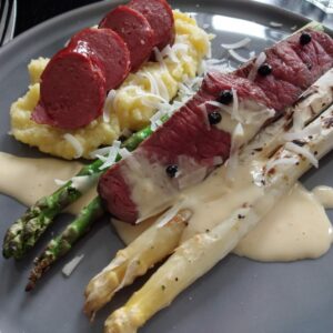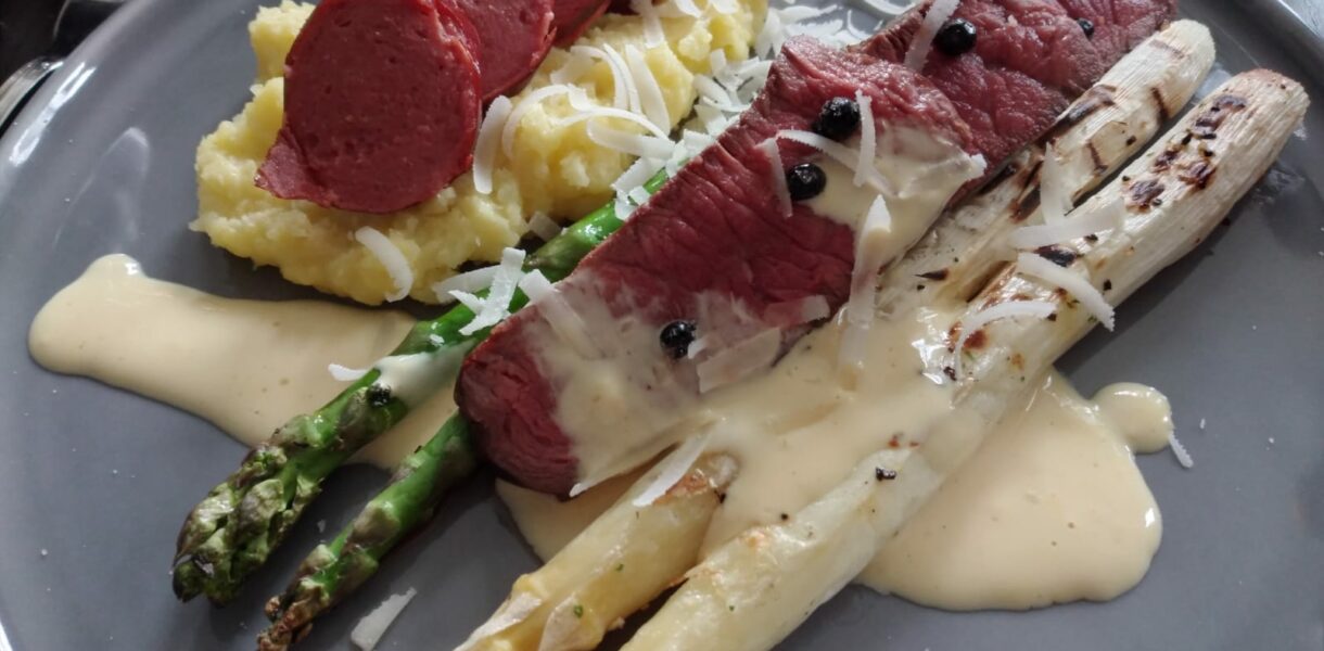 Steak und Wurst vom Weiderind an Spargel und Stampf