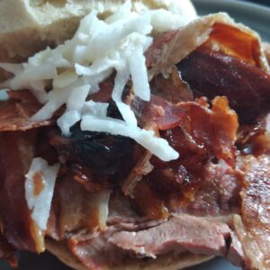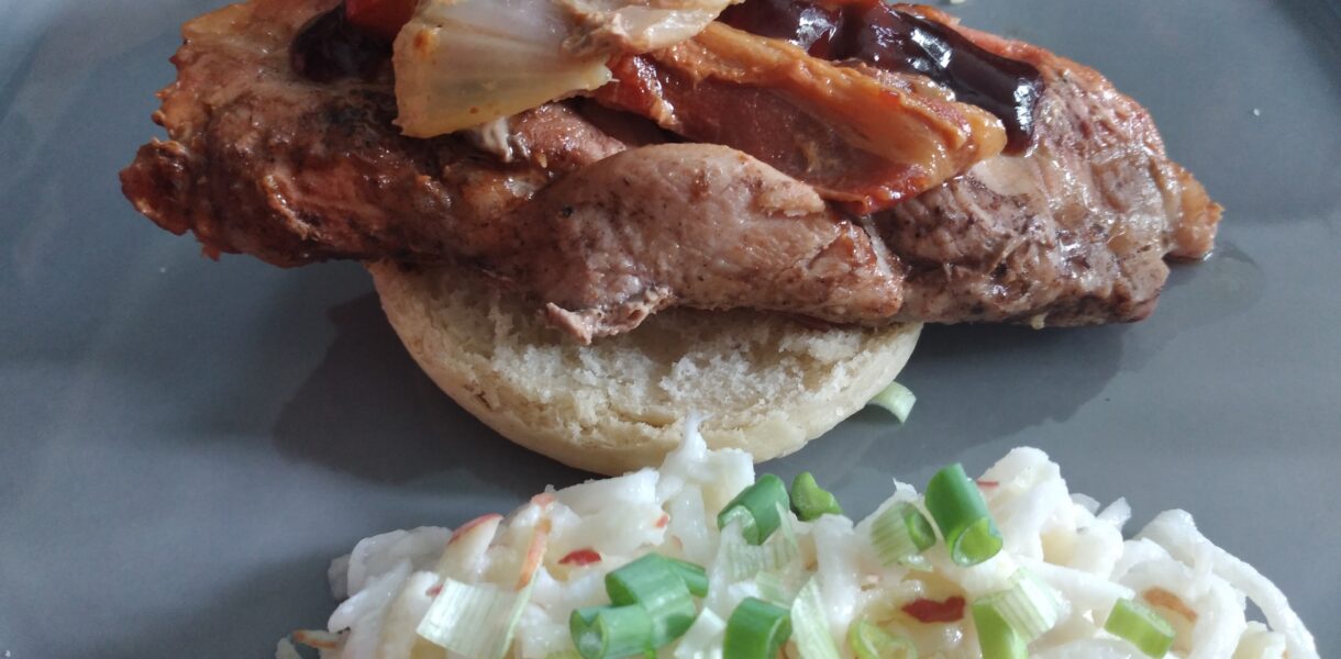 - Rettichsalat vorbereiten.Rettich und Apfel hobeln. Restliche Zutaten vermischen und unter den Rettich und Apfel mischen.Kalt stellen und ziehen lassen.Nun nehmen wir einen Dopf und legen diesen mit Bacon aus.Zwiebeln, Paprika und Fleisch in Streifen schneiden.Nun die Zutaten im Dopf schichtweise reinlegen.Beide Rubs vermischen und darüber geben.Nun die BBQ Sauce darauf verteilen und das Fleisch mit dem Bacon verschließen. Nun noch auf den Bacon den Honig geben.Deckel drauf.Bei 180-200 Grad im indirekten Bereich ziehen lassen.Die Semmeln die dazu gereicht wurden, waren ein Versuch.Guten Hunger.