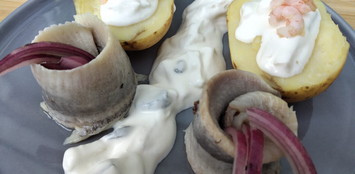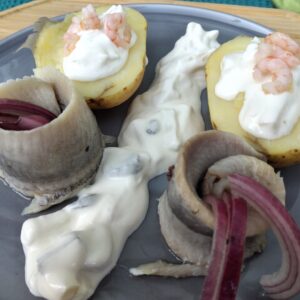 Hering aus dem Sud holen und auf den Teller geben, Kartoffel halbieren, Quark dazwischen verteilen, darauf die Garnelen nun und die Zwiebel auf den Matjes geben.