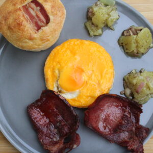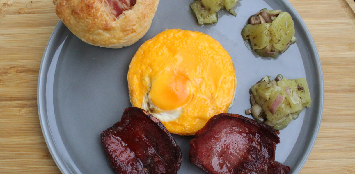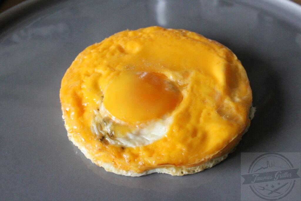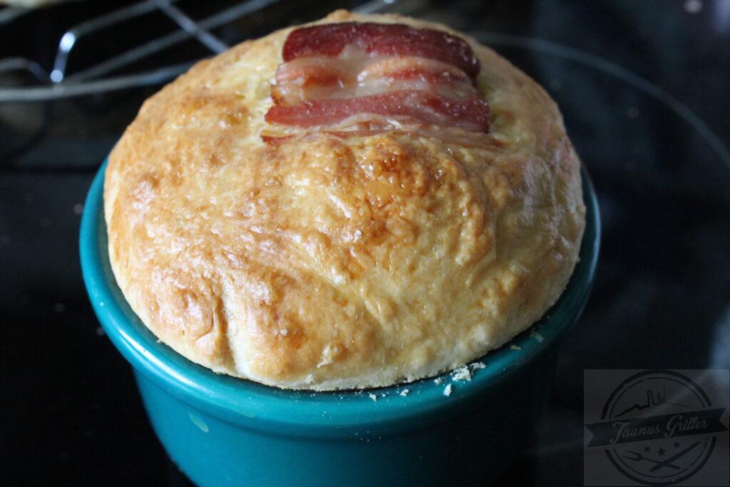 - Am Vortag:Handkäse und Zwiebeln in feine Würfel schneiden und in eine Schüssel geben.Nun den Kümmel darüber verteilen.Pfeffer, Salz, Essig und Öl verrühren und über den Handkäse geben und alles 24h ziehen lassen.Am Tag:Den Teig nach dem Rezept von Living BBQ herstellen.Den Teig in eine kleine Muffinform geben und im Backofen backen mit Ober/Unterhitze.In einer weiteren Form das Eiweiß anbacken und dann das Eigelb nach ca 60 Sekunden dazugeben. Nach 4 Minuten aus dem Ofen nehmen.Eine Stahlpfanne mit Butter und frischem Knoblauch auf den Seitenbrenner geben und die Zunge darin bei mittlerer Hitze 2 Minuten schwenken.Die Butter aus der Pfanne kann man Prima über die Zunge geben und mit dem Brioche dippen.