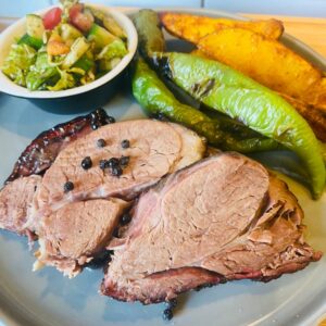 Ein grandioses Stück Fleisch dem wir unsere Aufmerksamkeit widmen. Es bedarf etwas Zeit, aber das Ergebnis ist ein super saftiger Braten, den man quasi ohne Messer schneiden kann. Ein toller Rauchring, einzigartiger Geschmack und eignet sich hervorragend als Sonntagsessen.Dazu passt ein gemischter grüner Salat wunderbar mit Kürbiskernöl.