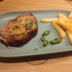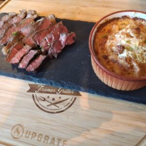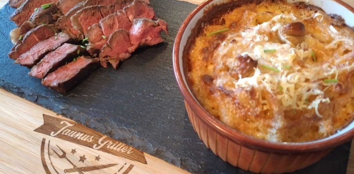 Beinscheibe ist längst nicht mehr nur ein Suppenfleisch.In meinem Fall wird die Rinderbeinscheibe ein Familiensteak.Von der Struktur natürlich nicht so zart wie Filet, aber definitiv mal was anderes.Als Beilage gibt's ein Mac'n Cheese Gratin mit Maronen.