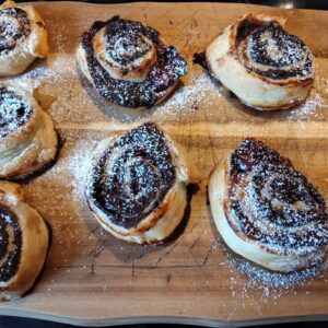 - Wir beginnen mit der Vorbereitung.Den Grill komplett ohne Pizzastein aufheizen. Equivalent den Backofen auf 180 Grad Umluft erhitzen.Den Blätterteig ausrollen, zuerst den Backmohn und dann darauf das Pflaumenmus verteilen und zusammen einrollen.Nun die Rolle in acht Streifen schneiden.Nun den Pizzastein in den indirekten Bereich mit den Schnecken legen und ca 15-20 Minuten backen.Im Ofen auf einem Backblech.Nun die Schnecken etwas abkühlen lassen und mit Puderzucker bestreuen und genießen.