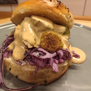 • Den Schweinenacken 1 Tag vorher marinieren.Dafür das Fleisch von allen Seiten mit den Rubs gut einmassieren und eingeschweißt im Kühlschrank ziehen lassen.Am gleichen Tag die Mayonnaise herstellen. Die äußeren Blätter vom Rotkohl entfernen, den Kohl halbieren und den Strunk entfernen.Nun mit einem Krauthobel raspeln oder mit dem Messer in feine Streifen schneiden. Mayonnaise mit den restlichen Zutaten vermengen und mit dem Rotkraut vermischen.Ebenfalls abgedeckt im Kühlschrank über Nacht ziehen lassen.Das Rezept für die Buns findet ihr im Internet.Am Tag des Essen nehme ich das Fleisch um 8 Uhr aus dem Kühlschrank.Der Grill wurde für indirekte Hitze 110 Grad vorbereitet.Um 10 Uhr ging es los.Räuchergut (hier Hickory und Whisky) im direkten Bereich und Fleisch im indirekten Bereich platzieren.Bei ca 69 Grad KT wickeln wir das Fleisch in Alufolie oder Butcherpaper und geben die BBQ Sauce mit der Cola hinzu.Alles gut verschließen und bei ca  92 Grad ist das Pulled Pork fertig.Lasst das Fleisch noch kurz ruhen.In dieser Zeit den Rosenkohl von seinen äußeren Blättern befreien, halbieren und in einer Pfanne mit Schweineschmalz von beiden Seiten scharf anbraten.Fleisch pullen und alles zusammen auf den Buns servieren.