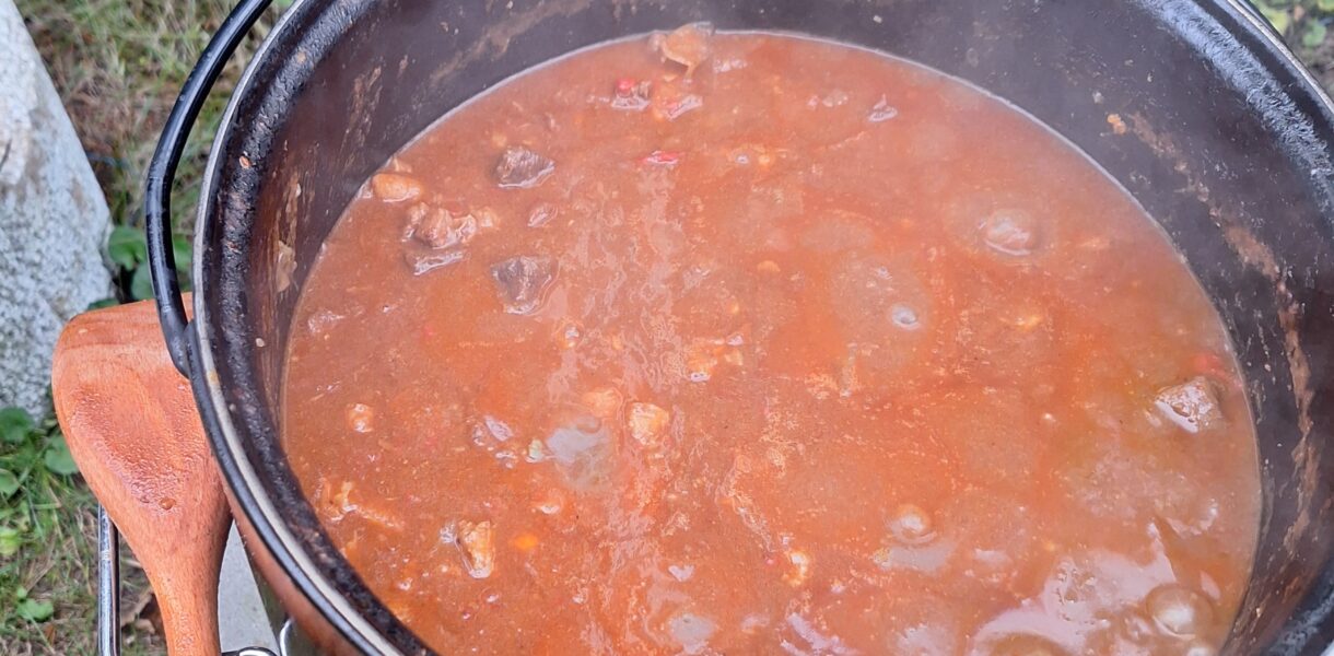 - Das Fleisch in ca. 3cm große Stücke schneiden. Gemüse grob zerkleinern.Die Gulaschkanone mit Holz anfeuern und für konstante Hitze sorgen. Schmalz hinzugeben und zuerst das Fleisch nach und nach anbraten. Das fertig angebratene Fleisch in einer Schüssel parken. Nun das Gemüse anschwitzen und das Fleisch hinzugeben. Jetzt Paprika und Tomatenmark, Gemüsebrühe, Pfeffer und Salz einrühren. Zum Schluss den Traubensaft einfüllen und alles für ca. 3,5 h köcheln lassen. Alles nochmal abschmecken und mit einem frischen Brötchen servieren.