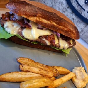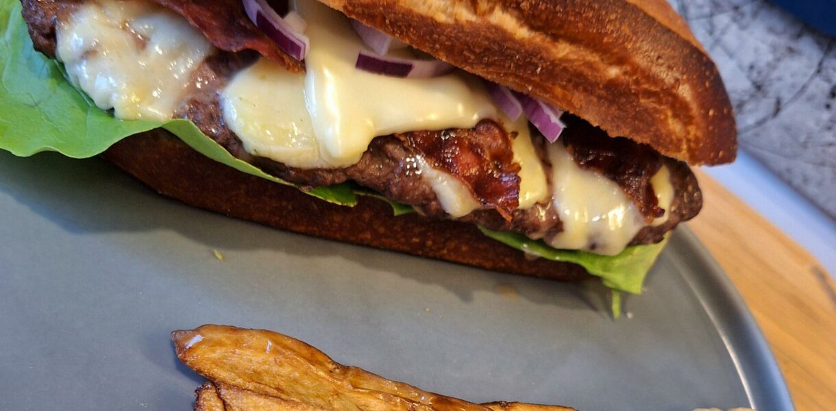 - Das Hack mischen wir mit den Gewürzen. Nun forme ich die Patties(ca 200g) entsprechend der Größe der Buns vor und lasse sie mindestens 5-6 h im Kühlschrank in Frischhaltefolie ziehen.Die Kartoffeln schneide ich in eine Größe von Steakhousepommes und lege sie in eine Schüssel mit kaltem Wasser für ca 30 Minuten.Danach tausche ich das Wasser aus und lasse die Pommes nochmal für 45 Minuten im Wasser. Danach wird das Wasser abgeschüttet.Die Beilagen bereiten wir uns einfach 30 Minuten vor dem servieren vor, da gibt es ja nichts weiter zu beachten.Den Grill für direkte Hitze vorbereiten.Bacon und Patties auf dem Grill zubereiten. Je Seite habe ich ca. 3 Minuten bei den Patties gebraucht.Nun Käse drauf und de Bacon und alles schön schmelzen lassen.Die Pommes werden 2x je ca 4 Minuten bei 180 Grad frittiert. Zwischen dem ersten und dem zweiten Frittierdurchgang ca 5 Minuten Pause.Der Burger ist schön intensiv im Geschmack.Auch wegen der perfekten Burgerbuns von Kröger's Brötchen aus Kirdorf.
