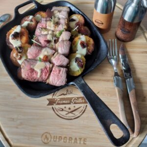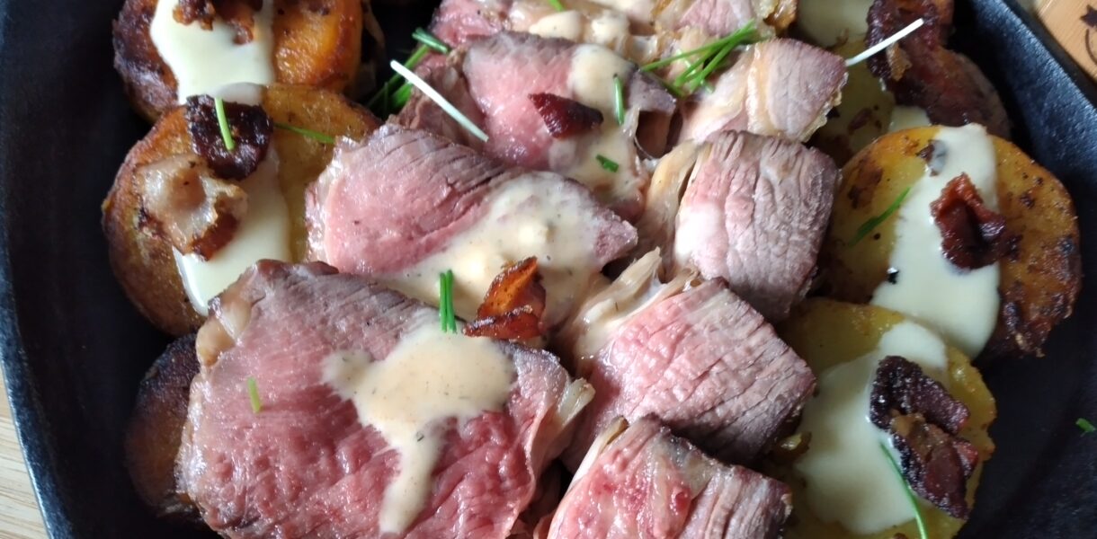 Diese Kombination ist deftig aber sehr lecker.Die Beilage sind Bratkartoffeln mit einr milden Sauce Hollondaise, das Steak tranchiert und mit Raclette-Sauce übergossen.