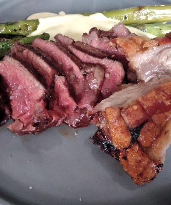 Glücklicher Büffel trifft feinen grünen Babyspargel an Sauce Bérnaise.