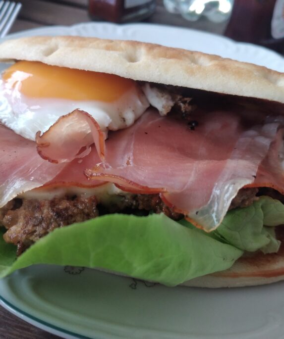 Ein sehr fluffiger Pattie, Cheddar, Spiegelei, Schwarzwälder Schinken und fertig ist das Panini.Okay etwas Salat gab es auch dazu.