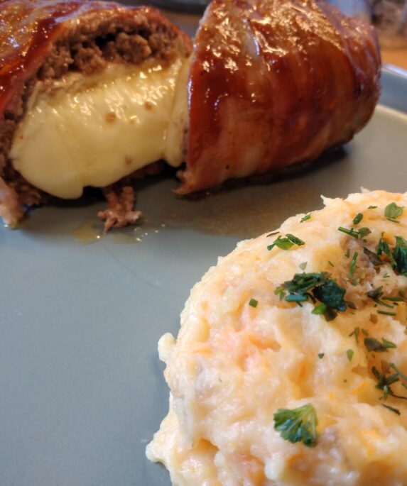 Cremig, saftig und einfach lecker.Als Beilage diente ein Stampf aus Kartoffel, Süßkartoffel und Möhre.Deftig und für den großen Hunger